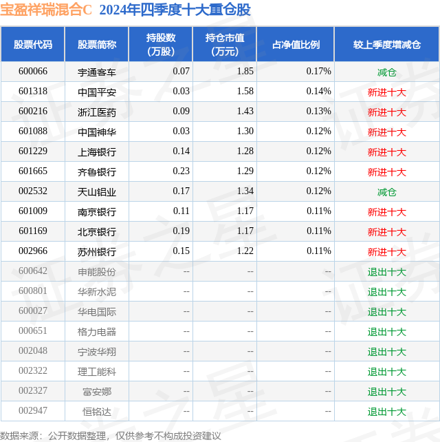 从基金规模来看,宝盈祥瑞混合C基金2024年四季度公布的基金规模为0.06亿元,较上一期规模12.09万元变化了598.5万元,环比变化了4948.95%。该基金最新一期资产配置为:股票占净值比1.94%,债券占净值比66.16%,现金占净值比27.71%。从基金持仓来看,该基金当季前十大股票仓位达1.25%,第一大重仓股为宇通客车(600066),持仓占比为0.17%。