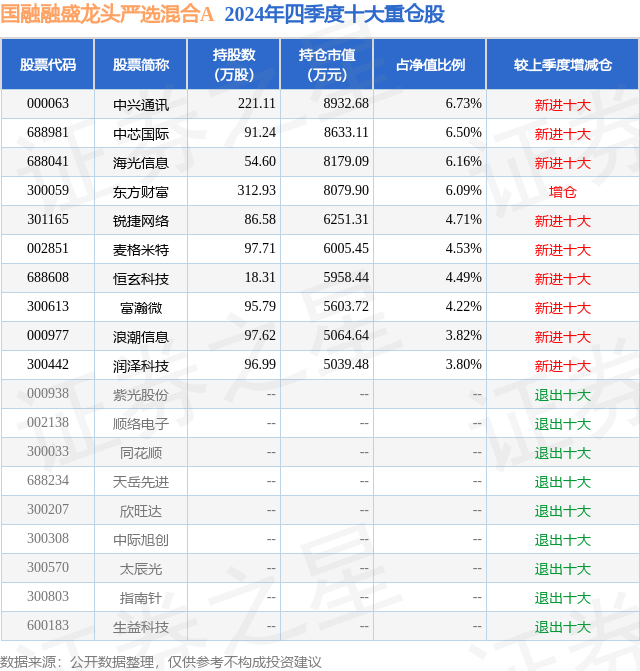 证券之星消息,日前国融融盛龙头严选混合A基金公布四季报,2024年四季度最新规模3.13亿元,季度净值涨幅为9.9%。