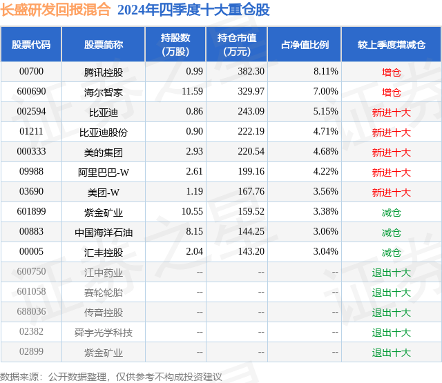 从基金规模来看,长盛研发回报混合基金2024年四季度公布的基金规模为0.47亿元,较上一期规模4874.21万元变化了-158.08万元,环比变化了-3.24%。该基金最新一期资产配置为:股票占净值比80.6%,无债券类资产,现金占净值比19.8%。从基金持仓来看,该基金当季前十大股票仓位达46.91%,第一大重仓股为腾讯控股(00700),持仓占比为8.11%。