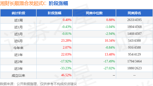 从业绩表现来看,湘财长顺混合发起式C基金过去一年净值涨幅为22.03%,在同类基金中排名954/4129,同类基金过去一年净值涨幅中位数为13.48%。而基金过去一年的最大回撤为-13.41%,成立以来的最大回撤为-54.51%。