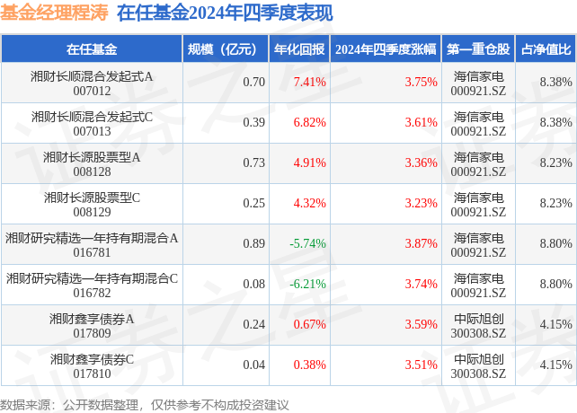 从基金规模来看,湘财长顺混合发起式C基金2024年四季度公布的基金规模为0.39亿元,较上一期规模5416.19万元变化了-1556.84万元,环比变化了-28.74%。该基金最新一期资产配置为:股票占净值比84.35%,债券占净值比5.16%,现金占净值比11.01%。从基金持仓来看,该基金当季前十大股票仓位达57.45%,第一大重仓股为海信家电(000921),持仓占比为8.38%。