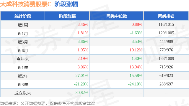 从业绩表现来看,大成科技消费股票C基金过去一年净值涨幅为3.06%,在同类基金中排名715/926,同类基金过去一年净值涨幅中位数为13.94%。而基金过去一年的最大回撤为-17.14%,成立以来的最大回撤为-48.38%。