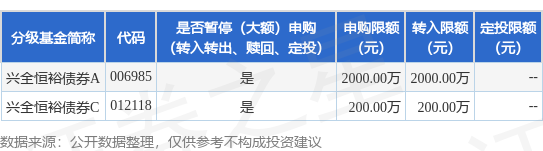 证券之星消息,2月5日兴证全球基金管理有限公司发布《关于兴全恒裕债券型证券投资基金暂停接受大额申购(含定投)、大额转换转入申请的公告》。公告中提示,为了保证基金的平稳运作,保护基金持有人利益,自2025年2月5日起兴全恒裕债券型证券投资基金暂停接受大额申购(含定投)、大额转换转入申请,下属分级基金调整明细如下: