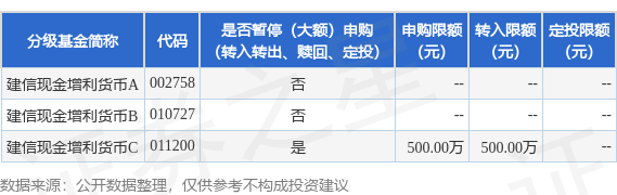 证券之星消息,2月7日建信基金管理有限责任公司发布《建信现金增利货币市场基金C类基金份额在代销销售渠道暂停大额申购、大额转换转入、定期定额投资公告》。公告中提示,为保护投资者利益,自2025年2月10日起建信现金增利货币市场基金C类基金份额在代销销售渠道暂停大额申购、大额转换转入、定期定额投资,申购、转换转入上限金额为500.0万元,下属分级基金调整明细如下: