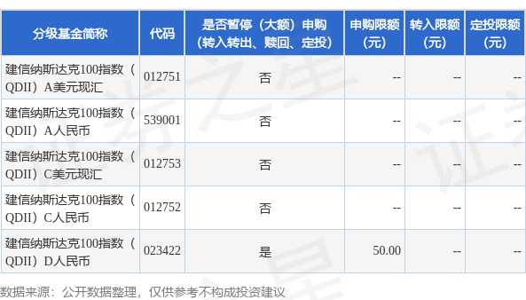 证券之星消息,2月12日建信基金管理有限责任公司发布《建信纳斯达克100指数型证券投资基金(QDII)D类(人民币)基金份额暂停大额申购、定期定额投资公告》。公告中提示,为QDII额度限制,自2025年2月12日起建信纳斯达克100指数型证券投资基金(QDII)D类(人民币)基金份额暂停大额申购、定期定额投资,下属分级基金调整明细如下: