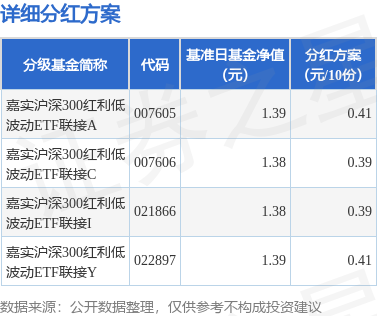 证券之星消息,2月14日发布《嘉实沪深300红利低波动交易型开放式指数证券投资基金联接基金2025年第一次收益分配公告》。本次分红为2025年的第一次分红。公告显示,本次分红的收益分配基准日为1月1日,详细分红方案如下:
