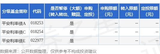 证券之星消息,2月15日平安基金管理有限公司发布《关于平安利率债债券型证券投资基金调整大额申购、定期定额投资及转换转入业务的公告》。公告中提示,为满足广大投资人的投资需求,自2025年2月17日起平安利率债债券型证券投资基金调整大额申购、定期定额投资及转换转入业务,下属分级基金调整明细如下: