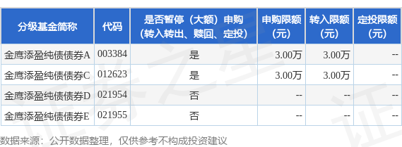 证券之星消息,2月17日金鹰基金管理有限公司发布《金鹰基金管理有限公司关于金鹰添盈纯债债券型证券投资基金A、C类份额暂停大额申购(含转换转入、定期定额投资)的公告》。公告中提示,为保证本基金的稳定运作以及为保护基金份额持有人的利益,自2025年2月17日起金鹰基金管理有限公司关于金鹰添盈纯债债券型证券投资基金A、C类份额暂停大额申购(含转换转入、定期定额投资),申购、转换转入上限金额为3.0万元,下属分级基金调整明细如下: