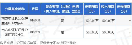 证券之星消息,2月19日南方基金管理股份有限公司发布《关于南方中证长江保护主题交易型开放式指数证券投资基金联接基金限制大额申购、定投和转换转入业务的公告》。公告中提示,为保护基金份额持有人的利益,自2025年2月5日起南方中证长江保护主题交易型开放式指数证券投资基金联接基金限制大额申购、定投和转换转入业务,申购、转换转入上限金额为500.0万元,下属分级基金调整明细如下: