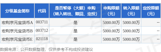 证券之星消息,2月20日宏利基金管理有限公司发布《宏利京元宝货币市场基金调整大额申购、大额转换转入、大额定期定额投资业务的公告》。公告中提示,为了满足投资者的需求,并保证基金的平稳运作,保护基金份额持有人的利益,自2025年2月21日起宏利京元宝货币市场基金调整大额申购、大额转换转入、大额定期定额投资业务,申购、转换转入上限金额为5000.0万元,下属分级基金调整明细如下: