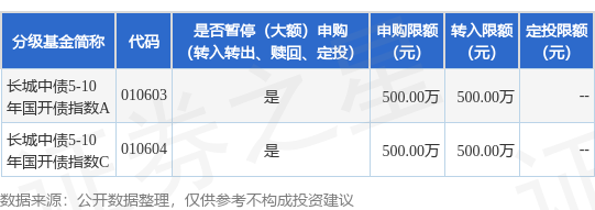 证券之星消息,2月21日长城基金管理有限公司发布《长城中债5-10年国开行债券指数证券投资基金暂停大额申购、转换转入、定期定额投资业务的公告》。公告中提示,为保证基金的稳定运作,保护基金份额持有人利益,自2025年2月24日起长城中债5-10年国开行债券指数证券投资基金暂停大额申购、转换转入、定期定额投资业务,下属分级基金调整明细如下: