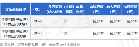 证券之星消息,2月22日华泰柏瑞基金管理有限公司发布《华泰柏瑞中证2000交易型开放式指数证券投资基金发起式联接基金调整大额申购(含转换转入、定期定额投资)业务的公告》。公告中提示,为保证本基金的稳定运作,保护基金份额持有人利益,以及根据《华泰柏瑞中证2000交易型开放式指数证券投资基金发起式联接基金基金合同》的相关规定,自2025年2月24日起华泰柏瑞中证2000交易型开放式指数证券投资基金发起式联接基金调整大额申购(含转换转入、定期定额投资)业务,申购、转换转入上限金额为10.0万元,下属分级基金调整明细如下: