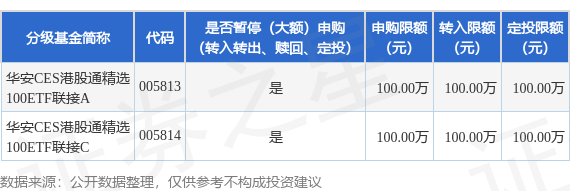 证券之星消息,2月24日华安基金管理有限公司发布《关于华安CES港股通精选100交易型开放式指数证券投资基金联接基金暂停大额申购、大额转换转入及大额定期定额投资的公告》。公告中提示,为了保证基金的平稳运作,保护基金持有人利益,本基金管理人决定自2025年2月25日起暂停本基金的大额申购、大额转换转入及大额定期定额投资业务,自2025年2月25日起华安CES港股通精选100交易型开放式指数证券投资基金联接基金暂停大额申购、大额转换转入及大额定期定额投资,申购、转换转入上限金额为100.0万元,下属分级基金调整明细如下: