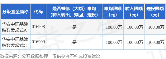 证券之星消息,2月24日华安基金管理有限公司发布《关于华安中证基建指数型发起式证券投资基金暂停大额申购、大额转换转入及大额定期定额投资的公告》。公告中提示,为了保证基金的平稳运作,保护基金持有人利益,本基金管理人决定自2025年2月25日起暂停本基金的大额申购、大额转换转入及大额定期定额投资业务,自2025年2月25日起华安中证基建指数型发起式证券投资基金暂停大额申购、大额转换转入及大额定期定额投资,申购、转换转入上限金额为100.0万元,下属分级基金调整明细如下: