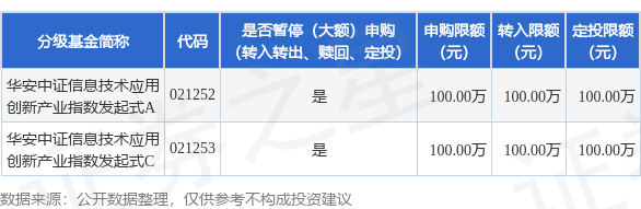 证券之星消息,2月24日华安基金管理有限公司发布《关于华安中证信息技术应用创新产业指数型发起式证券投资基金暂停大额申购、大额转换转入及大额定期定额投资的公告》。公告中提示,为了保证基金的平稳运作,保护基金持有人利益,本基金管理人决定自2025年2月25日起暂停本基金的大额申购、大额转换转入及大额定期定额投资业务,自2025年2月25日起华安中证信息技术应用创新产业指数型发起式证券投资基金暂停大额申购、大额转换转入及大额定期定额投资,申购、转换转入上限金额为100.0万元,下属分级基金调整明细如下:
