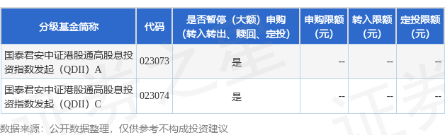 证券之星消息,2月25日上海国泰君安证券资产管理有限公司发布《关于国泰君安中证港股通高股息投资指数型发起式证券投资基金(QDII)暂停大额申购及定期定额投资业务的公告》。公告中提示,为了保证基金的平稳运作,保护基金份额持有人利益,自2025年2月25日起国泰君安中证港股通高股息投资指数型发起式证券投资基金(QDII)暂停大额申购及定期定额投资业务,申购上限金额为100.0万元,下属分级基金调整明细如下: