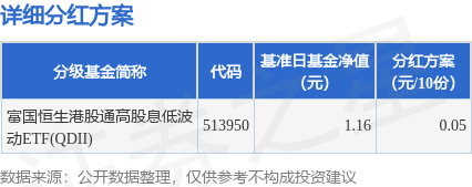 证券之星消息,2月28日发布《富国恒生港股通高股息低波动交易型开放式指数证券投资基金(QDII)2025年第一次收益分配公告》。本次分红为2025年度的第一次分红。公告显示,本次分红的收益分配基准日为1月1日,详细分红方案如下: