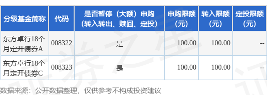 证券之星消息,3月7日东方基金管理股份有限公司发布《东方卓行18个月定期开放债券型证券投资基金暂停100元以上(不含100元)申购、转换转入投资公告》。公告中提示,为了保证基金的平稳运作,保护基金份额持有人利益,自2025年3月7日起东方卓行18个月定期开放债券型证券投资基金暂停100元以上(不含100元)申购、转换转入投资,下属分级基金调整明细如下: