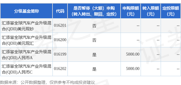 注:1、自2025年03月17日起(含2025年03月17日),汇添富全球汽车产业升级混合(QDII)人民币A暂停代销渠道的大额申购、大额定期定额投资业务,单日单个基金账户单笔或多笔累计申购、定期定额投资的金额不应超过5000人民币元(含5000人民币元)。当单日某基金账户单笔或多笔累计申购、定期定额投资该份额的金额超过5000人民币元,本公司将部分或全部拒绝。该份额恢复代销渠道的大额申购、大额定期定额投资业务的具体时间将另行公告。该份额自2025年02月14日起恢复办理汇添富基金管理股份有限公司(以下简称“本公司”)线上直销系统的申购、定期定额投资业务并于同日起限制线上直销系统大额申购、大额定期定额投资业务金额为10000人民币元(详见本公司于2025年02月13日发布的《关于汇添富全球汽车产业升级混合型证券投资基金(QDII)人民币A类份额恢复线上直销系统的申购、定期定额投资业务,并限制大额申购、定期定额投资业务的公告》)。该份额仍暂停办理本公司直销中心的申购、定期定额投资业务。该份额赎回业务仍照常办理。