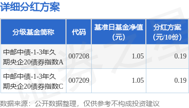 证券之星消息,3月19日发布《中邮中债-1-3年久期央企20债券指数证券投资基金分红公告》。本基金本次分红为2025年度第一次分红。公告显示,本次分红的收益分配基准日为3月3日,详细分红方案如下: