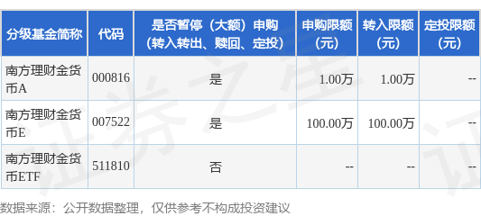 证券之星消息,3月20日南方基金管理股份有限公司发布《南方基金管理股份有限公司关于调整旗下南方理财金交易型货币市场基金A类基金份额在部分销售机构的申购、定投和转换转入业务金额限制的公告》。公告中提示,为保护基金份额持有人的利益,自2025年3月20日起南方基金管理股份有限公司关于调整旗下南方理财金交易型货币市场基金A类基金份额在部分销售机构的申购、定投和转换转入业务金额限制,申购、转换转入上限金额为1.0万元,下属分级基金调整明细如下: