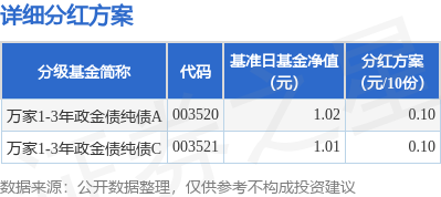 证券之星消息,3月20日发布《万家1-3年政策性金融债纯债债券型证券投资基金分红公告》。2025年第1次分红。公告显示,本次分红的收益分配基准日为3月3日,详细分红方案如下: