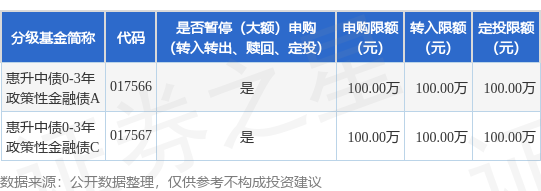 证券之星消息,3月25日惠升基金管理有限责任公司发布《惠升中债0-3年政策性金融债指数证券投资基金限制大额申购、定期定额投资和转换转入业务的公告》。公告中提示,为保护基金份额持有人的利益,追求平稳运作,自2025年3月25日起惠升中债0-3年政策性金融债指数证券投资基金限制大额申购、定期定额投资和转换转入业务,申购、转换转入、定投上限金额为100.0万元,下属分级基金调整明细如下: