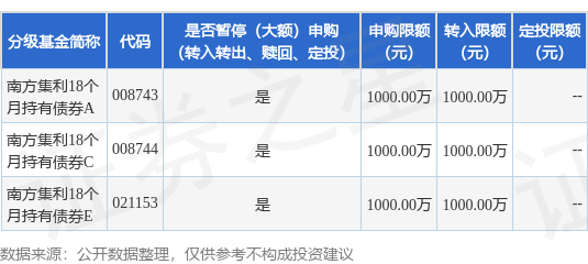 证券之星消息,3月26日南方基金管理股份有限公司发布《关于调整南方集利18个月持有期债券型证券投资基金申购、定投和转换转入金额限制的公告》。公告中提示,为满足广大投资人的投资需求,自2025年3月26日起调整南方集利18个月持有期债券型证券投资基金申购、定投和转换转入金额限制,申购、转换转入上限金额为1000.0万元,下属分级基金调整明细如下: