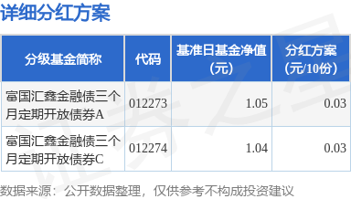 证券之星消息,3月26日发布《富国汇鑫金融债三个月定期开放债券型证券投资基金2025年第一次收益分配公告》。本次分红为2025年度的第一次分红。公告显示,本次分红的收益分配基准日为3月3日,详细分红方案如下: