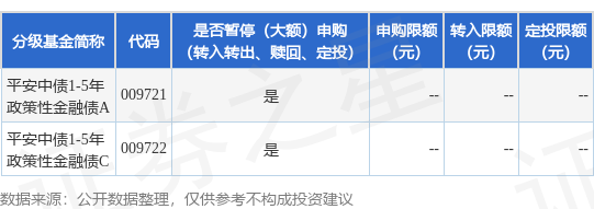 证券之星消息,4月3日平安基金管理有限公司发布《关于平安中债1-5年政策性金融债指数证券投资基金调整大额申购、定期定额投资及转换转入业务的公告》。公告中提示,为了保证基金的平稳运作,保护基金持有人的利益,自2025年4月3日起平安中债1-5年政策性金融债指数证券投资基金调整大额申购、定期定额投资及转换转入业务,申购、转换转入上限金额为1.0亿元,下属分级基金调整明细如下: