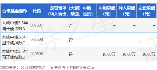 证券之星消息,4月14日大成基金管理有限公司发布《关于大成中债3-5年国开行债券指数证券投资基金暂停大额申购(含定期定额申购)及转换转入业务的公告》。公告中提示,为维护基金份额持有人利益,保障基金的平稳运作,自2025年4月15日起大成中债3-5年国开行债券指数证券投资基金暂停大额申购(含定期定额申购)及转换转入业务,申购、转换转入上限金额为10.0万元,下属分级基金调整明细如下: