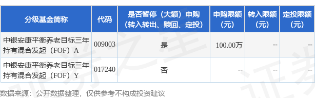 证券之星消息,4月14日中银基金管理有限公司发布《关于中银安康平衡养老目标三年持有期混合型发起式基金中基金(FOF)暂停机构投资者大额申购及定期定额投资业务的公告》。公告中提示,为保护基金份额持有人利益,自2025年4月14日起中银安康平衡养老目标三年持有期混合型发起式基金中基金(FOF)暂停机构投资者大额申购及定期定额投资业务,下属分级基金调整明细如下: