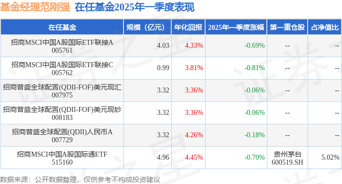 证券之星消息,日前招商MSCI中国A股国际通ETF基金公布一季报,2025年一季度最新规模4.96亿元,季度净值涨幅为-0.7%。