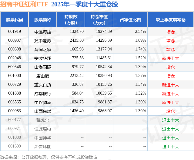 从基金规模来看,招商中证红利ETF基金2025年一季度公布的基金规模为75.79亿元,较上一期规模65.95亿元变化了9.83亿元,环比变化了14.91%。该基金最新一期资产配置为:股票占净值比99.62%,无债券类资产,现金占净值比0.44%。从基金持仓来看,该基金当季前十大股票仓位达15.71%,第一大重仓股为中远海控(601919),持仓占比为2.54%。