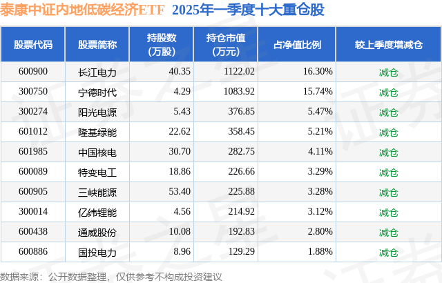 从基金规模来看,泰康中证内地低碳经济ETF基金2025年一季度公布的基金规模为0.69亿元,较上一期规模7462.09万元变化了-576.99万元,环比变化了-7.73%。该基金最新一期资产配置为:股票占净值比98.98%,债券占净值比0.17%,现金占净值比1.01%。从基金持仓来看,该基金当季前十大股票仓位达61.2%,第一大重仓股为长江电力(600900),持仓占比为16.3%。