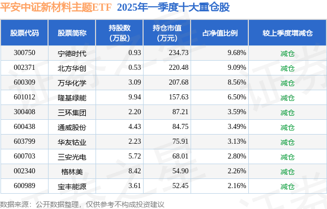 从基金规模来看,平安中证新材料主题ETF基金2025年一季度公布的基金规模为0.24亿元,较上一期规模2621.86万元变化了-196.03万元,环比变化了-7.48%。该基金最新一期资产配置为:股票占净值比96.83%,无债券类资产,现金占净值比2.89%。从基金持仓来看,该基金当季前十大股票仓位达51.26%,第一大重仓股为宁德时代(300750),持仓占比为9.68%。