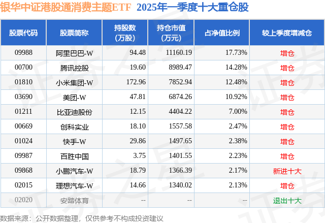 从基金规模来看,银华中证港股通消费主题ETF基金2025年一季度公布的基金规模为6.29亿元,较上一期规模2.61亿元变化了3.68亿元,环比变化了140.96%。该基金最新一期资产配置为:股票占净值比95.91%,无债券类资产,现金占净值比7.86%。从基金持仓来看,该基金当季前十大股票仓位达73.79%,第一大重仓股为阿里巴巴-W(09988),持仓占比为17.73%。