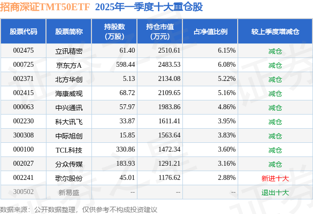 从基金规模来看,招商深证TMT50ETF基金2025年一季度公布的基金规模为4.08亿元,较上一期规模4.2亿元变化了-1148.03万元,环比变化了-2.73%。该基金最新一期资产配置为:股票占净值比99.27%,无债券类资产,现金占净值比0.81%。从基金持仓来看,该基金当季前十大股票仓位达44.89%,第一大重仓股为立讯精密(002475),持仓占比为6.15%。
