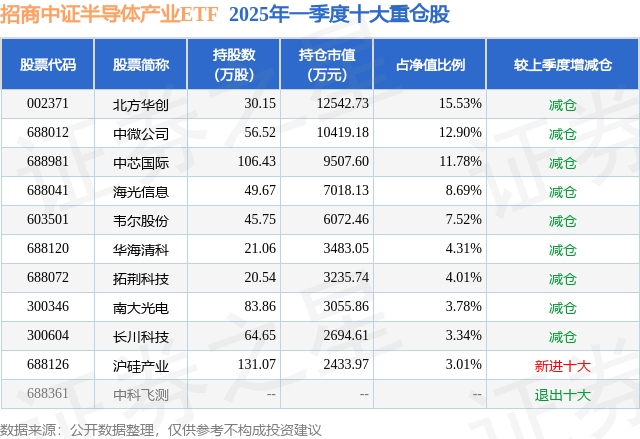 从基金规模来看,招商中证半导体产业ETF基金2025年一季度公布的基金规模为8.07亿元,较上一期规模9.1亿元变化了-1.03亿元,环比变化了-11.3%。该基金最新一期资产配置为:股票占净值比99.38%,无债券类资产,现金占净值比0.72%。从基金持仓来看,该基金当季前十大股票仓位达74.87%,第一大重仓股为北方华创(002371),持仓占比为15.53%。