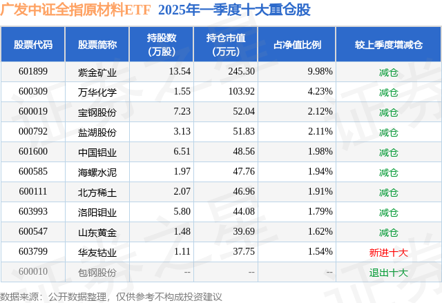 从基金规模来看,广发中证全指原材料ETF基金2025年一季度公布的基金规模为0.25亿元,较上一期规模2495.81万元变化了-38.64万元,环比变化了-1.55%。该基金最新一期资产配置为:股票占净值比98.78%,无债券类资产,现金占净值比1.82%。从基金持仓来看,该基金当季前十大股票仓位达29.22%,第一大重仓股为紫金矿业(601899),持仓占比为9.98%。