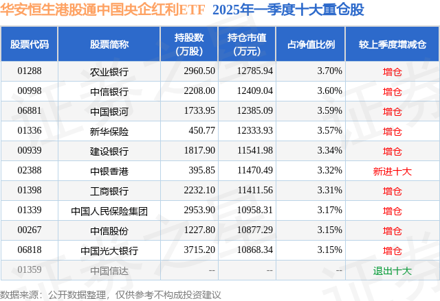 从基金规模来看,华安恒生港股通中国央企红利ETF基金2025年一季度公布的基金规模为34.52亿元,较上一期规模16.15亿元变化了18.37亿元,环比变化了113.74%。该基金最新一期资产配置为:股票占净值比96.64%,无债券类资产,现金占净值比4.31%。从基金持仓来看,该基金当季前十大股票仓位达33.9%,第一大重仓股为农业银行(01288),持仓占比为3.7%。