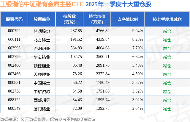 从基金规模来看,工银瑞信中证稀有金属主题ETF基金2025年一季度公布的基金规模为5.28亿元,较上一期规模5.32亿元变化了-404.49万元,环比变化了-0.76%。该基金最新一期资产配置为:股票占净值比99.61%,无债券类资产,现金占净值比0.49%。从基金持仓来看,该基金当季前十大股票仓位达53.94%,第一大重仓股为盐湖股份(000792),持仓占比为9.04%。