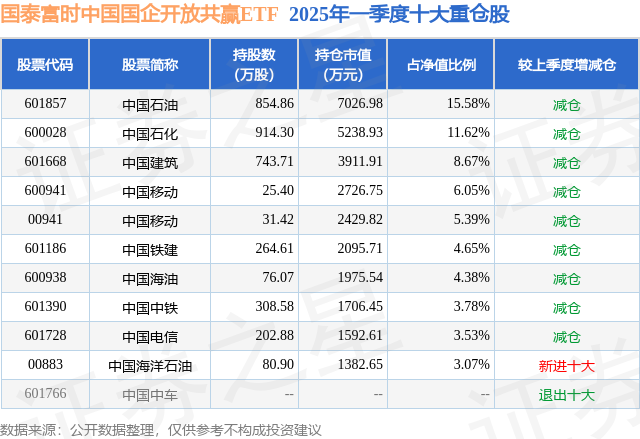 从基金规模来看,国泰富时中国国企开放共赢ETF基金2025年一季度公布的基金规模为4.51亿元,较上一期规模6.44亿元变化了-1.93亿元,环比变化了-30.02%。该基金最新一期资产配置为:股票占净值比99.19%,无债券类资产,现金占净值比0.9%。从基金持仓来看,该基金当季前十大股票仓位达66.72%,第一大重仓股为中国石油(601857),持仓占比为15.58%。