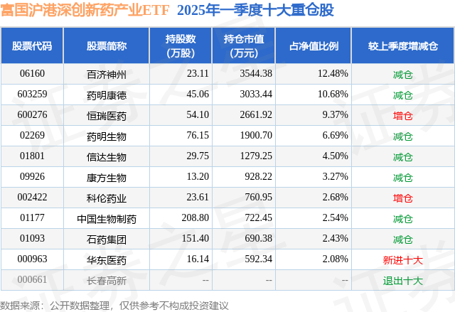 从基金规模来看,富国沪港深创新药产业ETF基金2025年一季度公布的基金规模为2.84亿元,较上一期规模2.46亿元变化了3823.31万元,环比变化了15.55%。该基金最新一期资产配置为:股票占净值比99.65%,无债券类资产,现金占净值比1.65%。从基金持仓来看,该基金当季前十大股票仓位达56.72%,第一大重仓股为百济神州(06160),持仓占比为12.48%。
