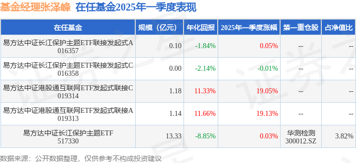 证券之星消息,日前易方达中证长江保护主题ETF基金公布一季报,2025年一季度最新规模13.33亿元,季度净值涨幅为0.03%。