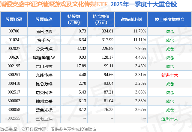 从基金规模来看,浦银安盛中证沪港深游戏及文化传媒ETF基金2025年一季度公布的基金规模为0.29亿元,较上一期规模3419.86万元变化了-558.55万元,环比变化了-16.33%。该基金最新一期资产配置为:股票占净值比95.98%,无债券类资产,现金占净值比3.79%。从基金持仓来看,该基金当季前十大股票仓位达53.79%,第一大重仓股为腾讯控股(00700),持仓占比为11.7%。