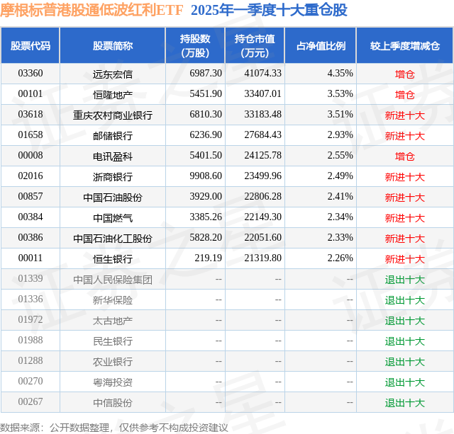 从基金规模来看,摩根标普港股通低波红利ETF基金2025年一季度公布的基金规模为94.52亿元,较上一期规模59.83亿元变化了34.68亿元,环比变化了57.97%。该基金最新一期资产配置为:股票占净值比99.73%,无债券类资产,现金占净值比0.6%。从基金持仓来看,该基金当季前十大股票仓位达28.7%,第一大重仓股为远东宏信(03360),持仓占比为4.35%。
