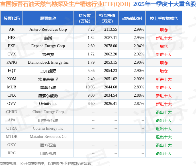 从基金规模来看,富国标普石油天然气勘探及生产精选行业ETF(QDII)基金2025年一季度公布的基金规模为7.07亿元,较上一期规模2.06亿元变化了5.02亿元,环比变化了243.87%。该基金最新一期资产配置为:股票占净值比99.76%,无债券类资产,现金占净值比0.26%。从基金持仓来看,该基金当季前十大股票仓位达29.14%,第一大重仓股为Antero Resources Corp(AR),持仓占比为2.99%。
