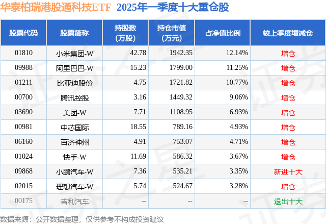 从基金规模来看,华泰柏瑞港股通科技ETF基金2025年一季度公布的基金规模为1.6亿元,较上一期规模1.06亿元变化了5372.91万元,环比变化了50.58%。该基金最新一期资产配置为:股票占净值比97.62%,无债券类资产,现金占净值比2.53%。从基金持仓来看,该基金当季前十大股票仓位达70.09%,第一大重仓股为小米集团-W(01810),持仓占比为12.14%。