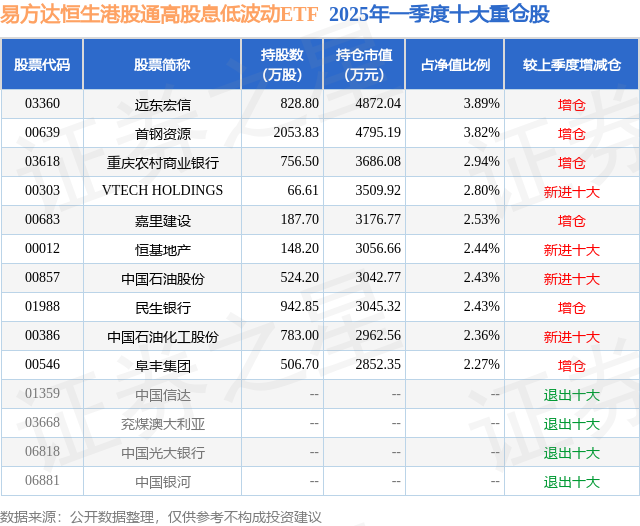 证券之星消息,日前易方达恒生港股通高股息低波动ETF基金公布一季报,2025年一季度最新规模12.54亿元,季度净值涨幅为3.65%。